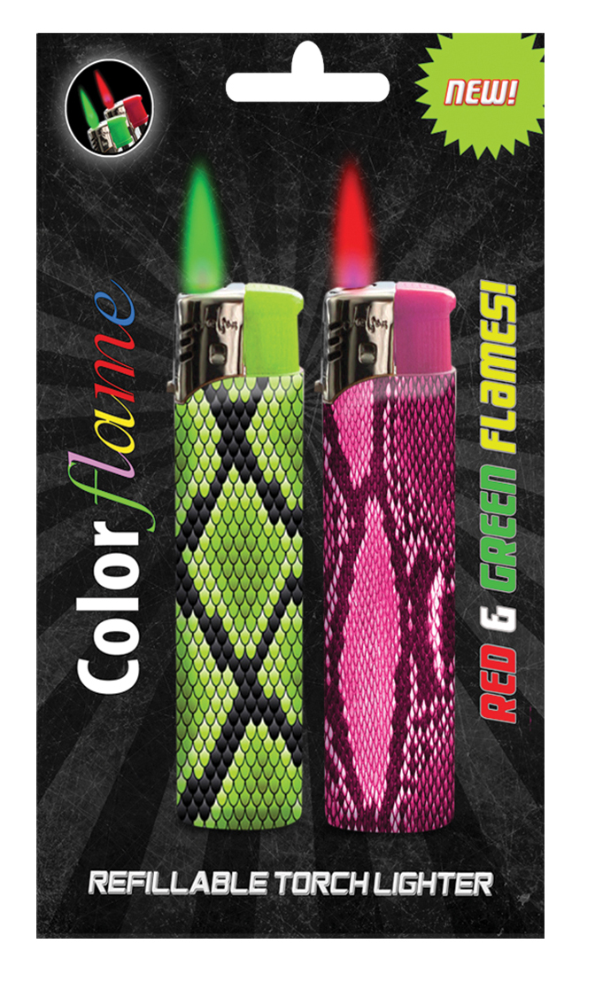 Colorflame lighters are open flame lighters that feature brightly colored fire when lit. COLORFLAME flames come in two colors per pack: Ruby Red and Neon Green.